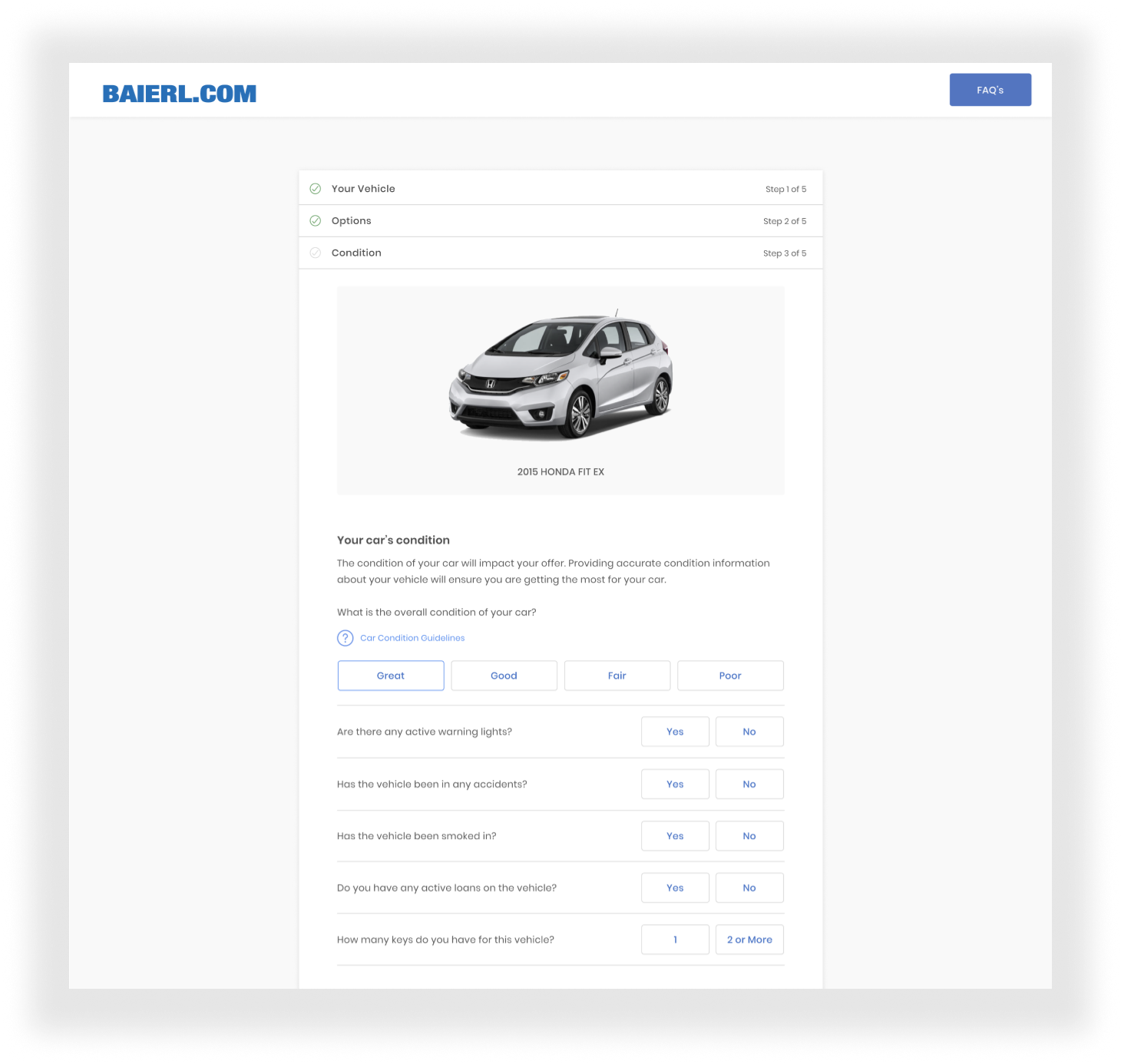 After testing and iterating on Fieldmate, I switched focuses to Baierl.com — a white-labeled online experience for giving potential customers an online estimate on their vehicle. This website offered a simple task for customers to complete that would inform the inspection. The task was filling out a few screens of questions about the vehicle, the mileage, and known damage. It resulted in an online offer that customers could move forward with booking an appointment for an inspection.